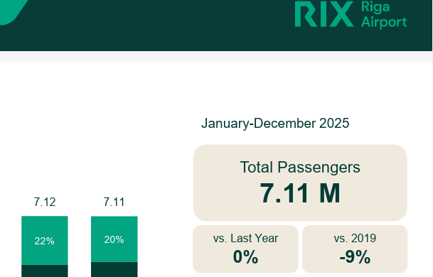 - Rīgas lidosta 25.gadā sarukusi par 10 tūkstošiem pasažieru, krītot no 7.12 miljoniem 24.gadā, ar vienādu lidojumu skaitu (63.2 tūksoši)